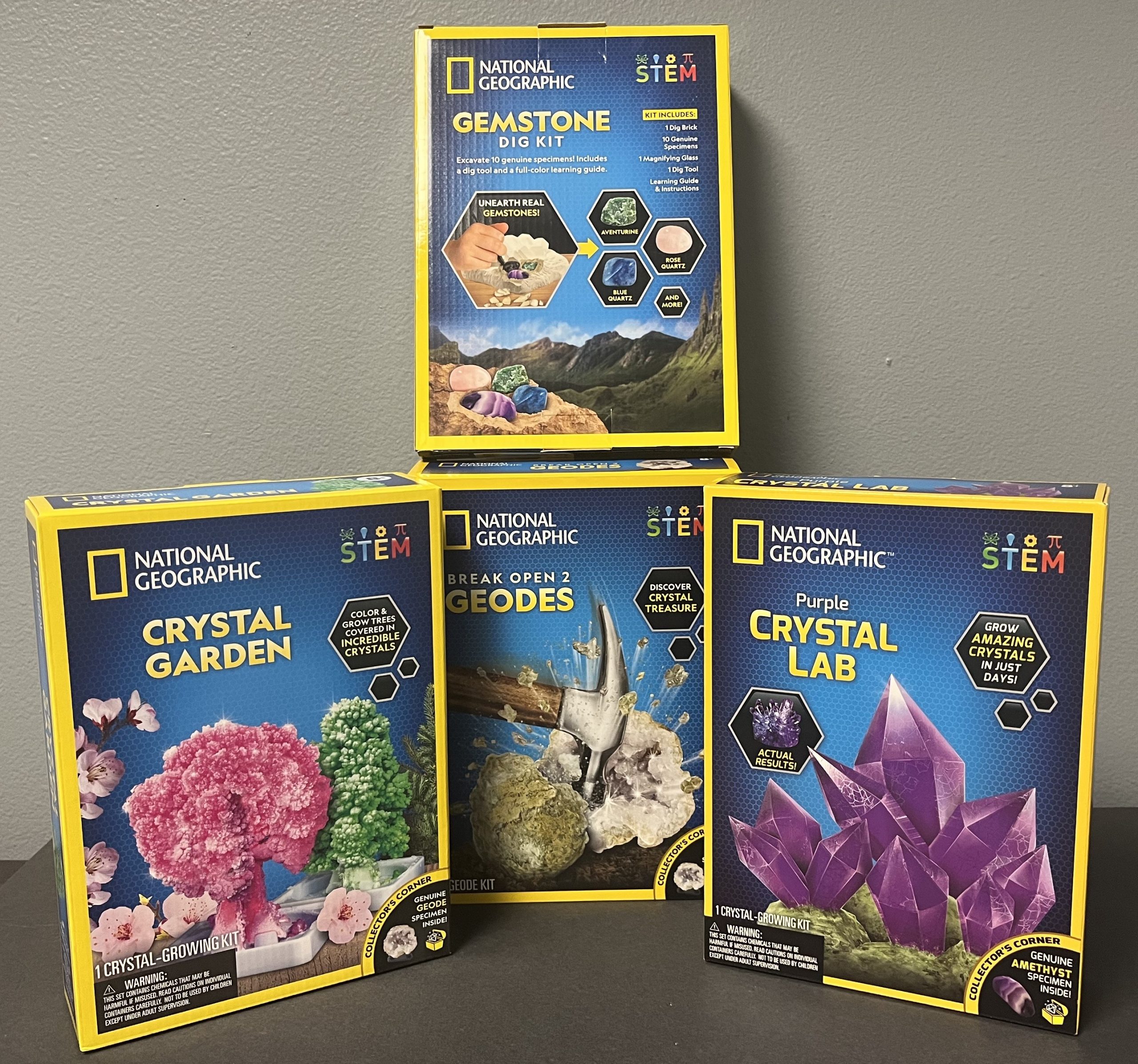 Your child(ren) will have hours of fun while learning with this package. You will receive four National Geographic Stem Kits including: Crystal Lab, Break the Geode, Gemstone Dig and Crystal Garden.