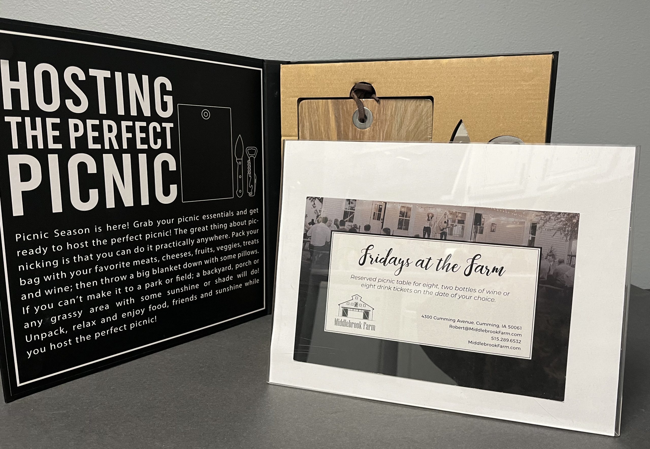Middlebrook Farm in Cumming, Iowa provides the perfect picnic outing for you and your friends. This package provides you with a reserved picnic table for eight, two bottles of wine or eight drink tickets on the date of your choice. You will also receive a picnic box with cheeseboard, knife and cork skewer.