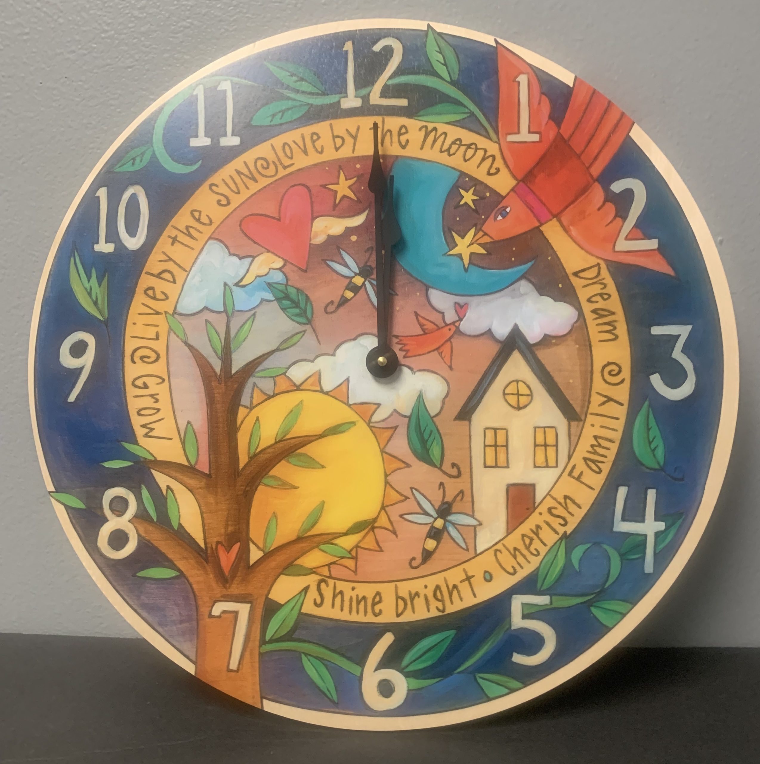 New to Sticks is this 18″ round clock which has a cozy home landscape with inspiring phrases to motivate you. Life seems to go by like a “Moment in Time” so stop and enjoy time with this Sticks Object Art & Furniture clock.