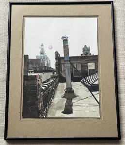 This piece is a Bill Fultz original watercolor with subdued shades. This piece is a picturesque look from a rooftop towards sunset, floated on a mat and professionally framed. What room do you envision this 15 x 19 1/2 treasure?