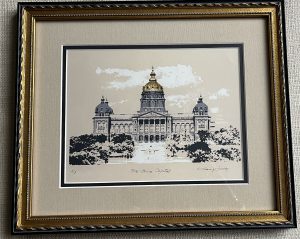The Iowa State Capitol is highlighted with the artistry from the late Bill Fultz. His A/P (Artist Proof = first one) is professionally matted and framed to enhance the beauty. This piece measures 15 1/2 x 13 and is a great size for a wall, desk or shelf.