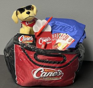 Raising Cane specializes in chicken fingers. This gift box includes 2 box combos, 1 kids combo, 3 lemonades, a lg t-shirt, notebook, lip balm and the official stuff mascot, Raising Cane.