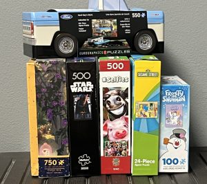 These six puzzles range from 24pc to 750pc. and are for every age in your home. These six puzzles range from Frosty to Star Wars and let the puzzle construction begin!