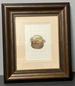 This art piece shows veggies in a wicker basket and is a signed and numbered print 333/1200. Bailey Tidwell’s etching ” Tossed Salad’ makes eating your greens more fun!