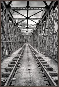 There’s something deeply compelling about a road not yet traveled — and this striking black and white canvas wrap captures exactly that feeling. Shot in perfect symmetry from the center of an aged iron trestle bridge, the tracks stretch into the distance, flanked by an intricate lattice of steel beams that draw the eye deeper and deeper into the frame. Brooding clouds peek through the ironwork overhead, while trees soften the edges of this industrial scene, creating a hauntingly beautiful contrast between nature and structure. The monochromatic palette gives this 30″ x 45″ large-format piece a timeless, almost cinematic quality in this sophisticated statement piece — equally at home in a modern loft, a rustic farmhouse or a classic study.