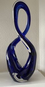 This piece is a contemporary vibrant, sapphire blue hand-blown glass sculpture referred to the Infinity or Love Knot design. This exquisite statement piece that is artist signed and measures 19 h x 7 1/2 w and weighs 12.4 lbs.