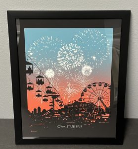 John Bosley, artist, created this Iowa State Fair piece with a night view which makes you reminisce or get ready for new adventures at the fair. This piece measures 11 x 14 which is framed and ready to display in your favorite room or office.