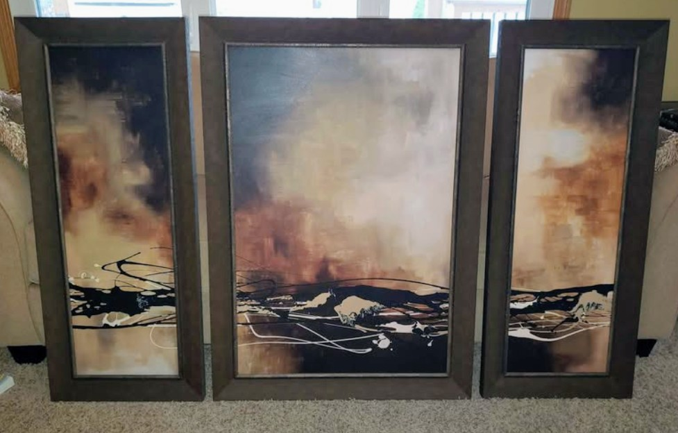 This triptych art has been z-gelled to give the texture of a canvas and professionally framed. The larger piece measures 41 x 29 and the 2 side pieces measure 41 x 17. These pieces are wonderful to put above a couch or use in a bedroom place of a headboard.