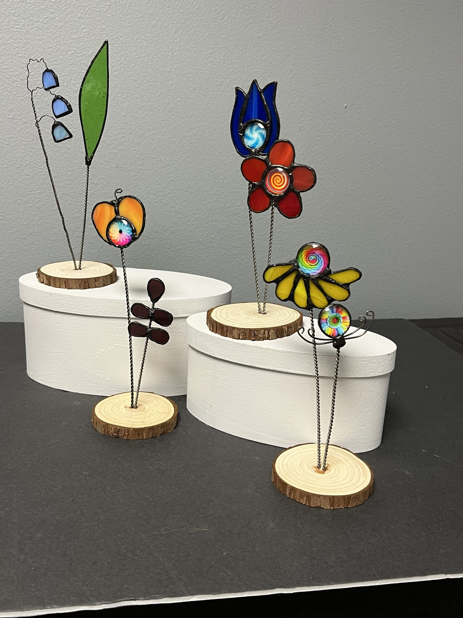 These one-of-a-kind pieces need no water and are low maintenance. These hand-soldered stained-glass florals will lighten up the room every time the sun kisses them. Cherish this 4-pc botanical set app 9″-10″ mounted to a wood disk. Embrace the light that shines through each one!