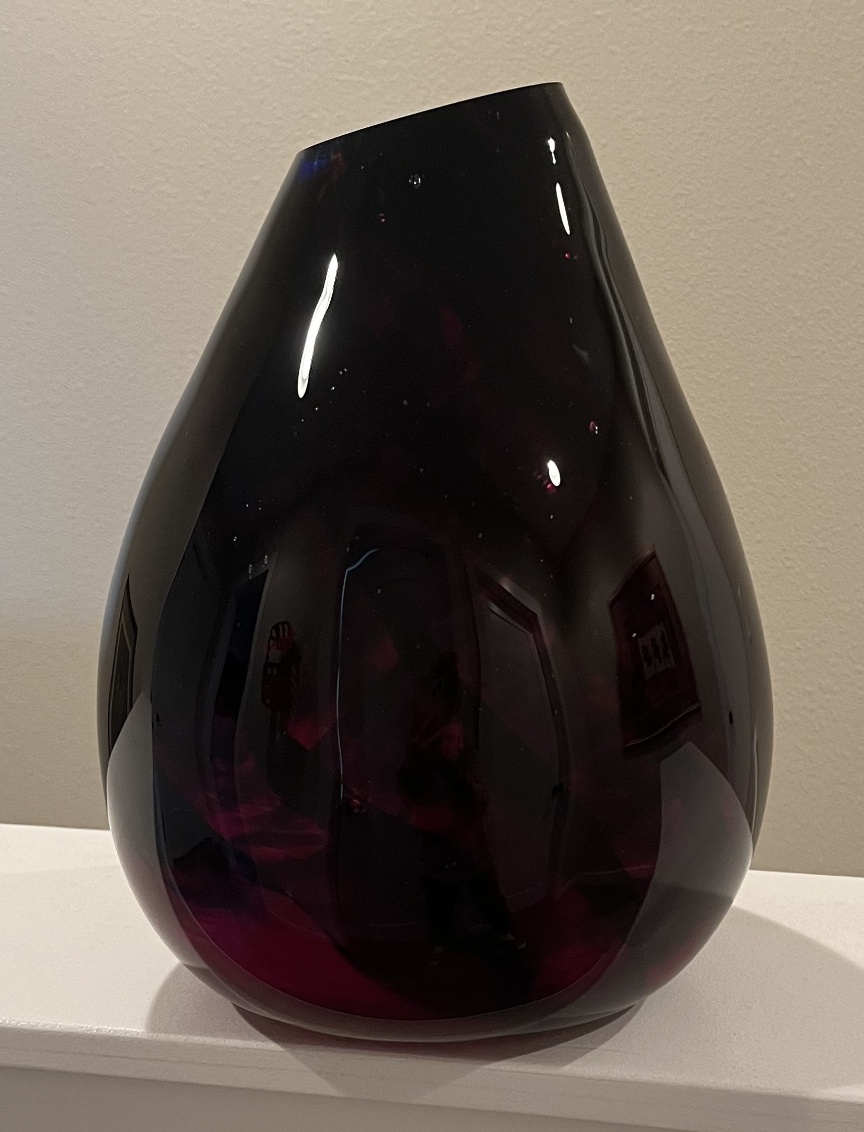 This teardrop burgundy hand-blown glass vase is ready to be a focal point in your home and enjoyed by all. This piece measures 13 h x 9 w and weighs 17.5 lbs. To top it off, this piece is signed by the artist.